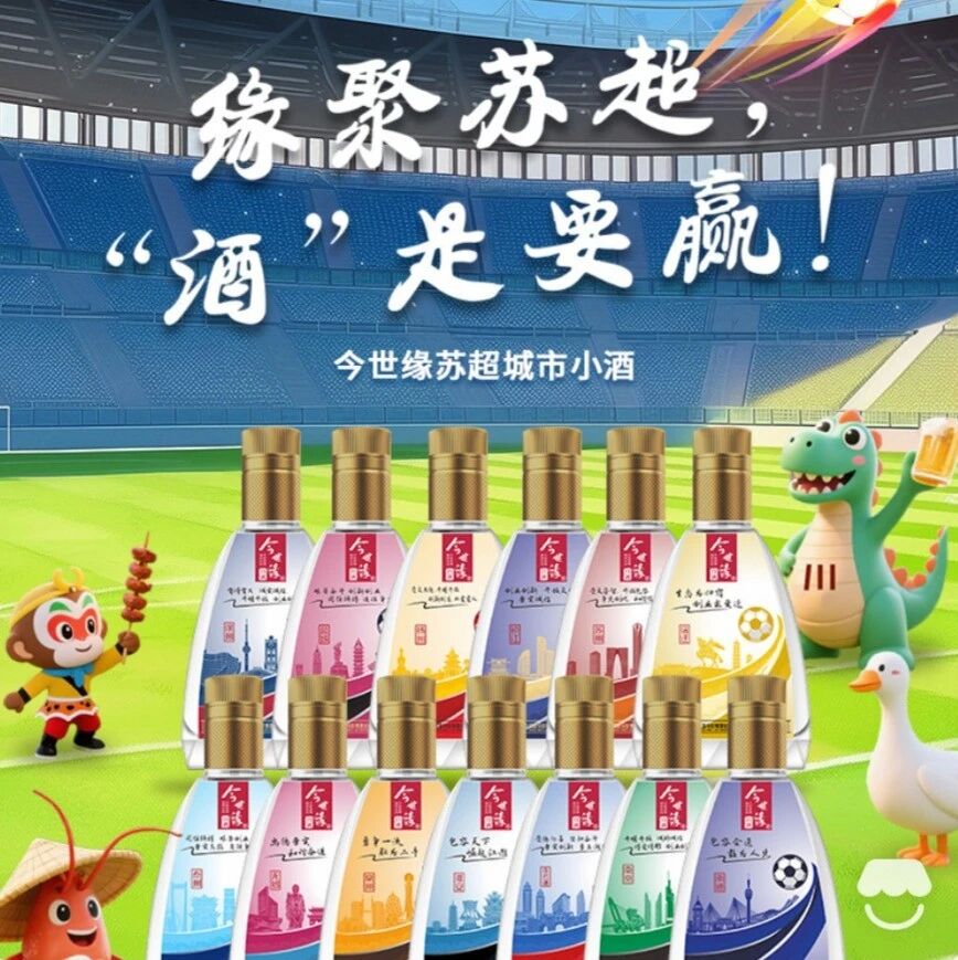 隨著“蘇超”出圈,今世緣迅速將流量轉化為貨架上的產品,推出了“蘇超城市小酒”和國緣V3×江蘇省城市足球聯賽聯名限量禮盒。這個聯名禮盒將江蘇13個設區(qū)市的城市元素融入設計,被球迷們戲稱為“十三太保”系列,成為不少球迷的收藏之選。