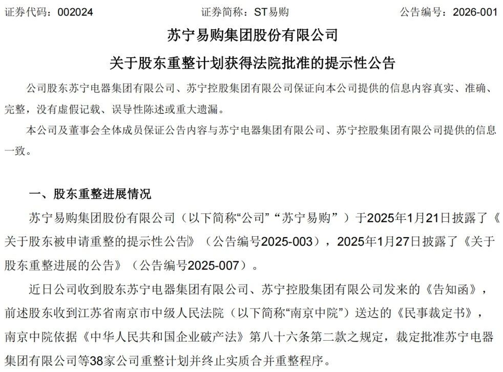 2026年1月4日,蘇寧易購(gòu)(ST易購(gòu),002024)發(fā)布《關(guān)于股東重整計(jì)劃獲得法院批準(zhǔn)的提示性公告》,披露了蘇寧系企業(yè)重整的最新進(jìn)展。